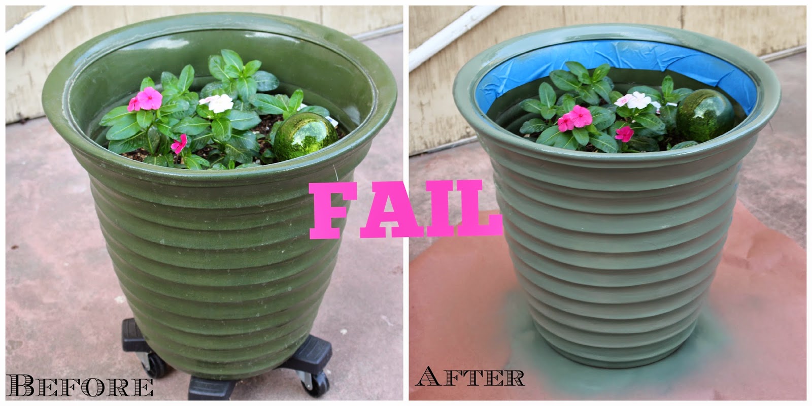 In my 1st attempt, I picked up a can of green spray paint I found in my garage and started spraying the pots. However, the color choice was a total FAIL! I went from a dark green pot to a dull green pot...womp, womp.